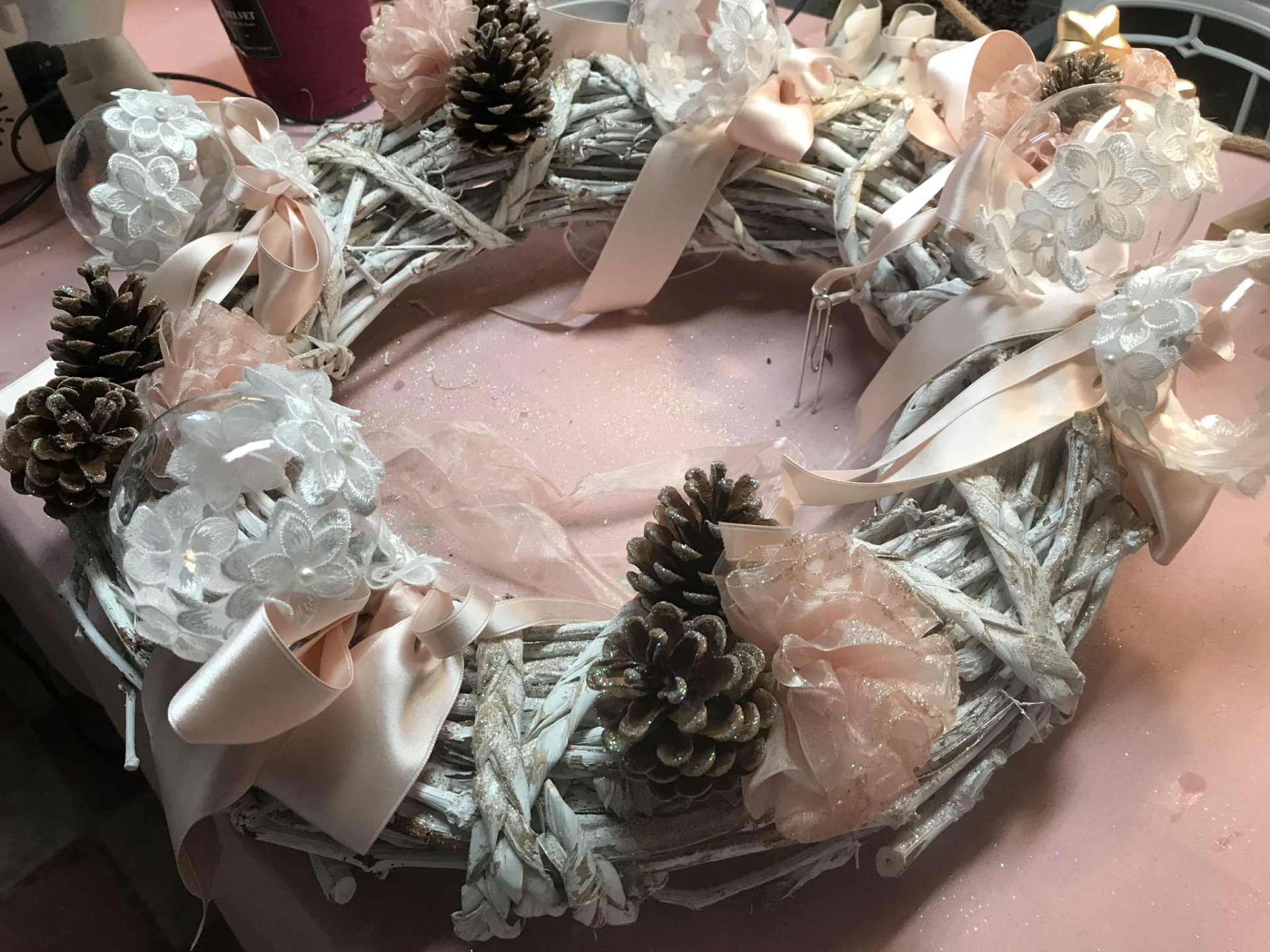 Composition: couronne de base en bois de frêne, boules de 8 cm en verre rehaussées de brodéries perlées, pommes de pin naturelles, ruban de satin double face rose poudré, ruban d'organza travaillé en rosaces rose poudré.