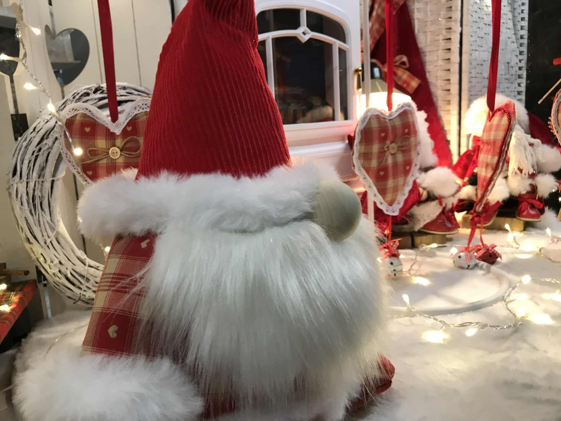 Le lutin rouge est une réalisation classique, son prix se justifie par la qualité des matières utilisées, tissu madras rouge et beige rehaussé de petits coeurs, velours côtelé de coton rouge, les fourrures ne pas d'origine animale.