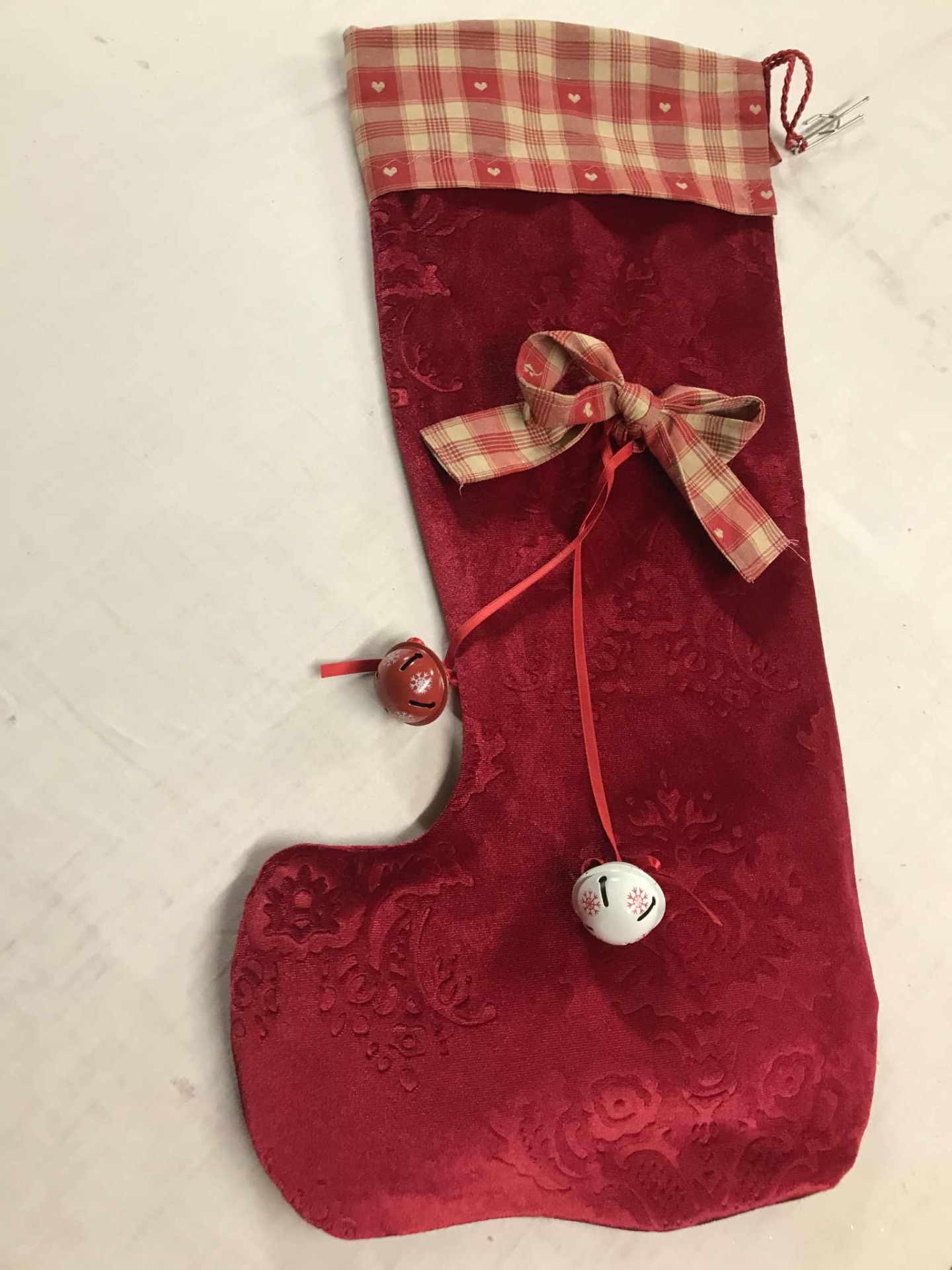 la botte Gulliver est composée de velours rouge damassé, de tissu de Madras, deux grelots agrémentent l'ensemble.
