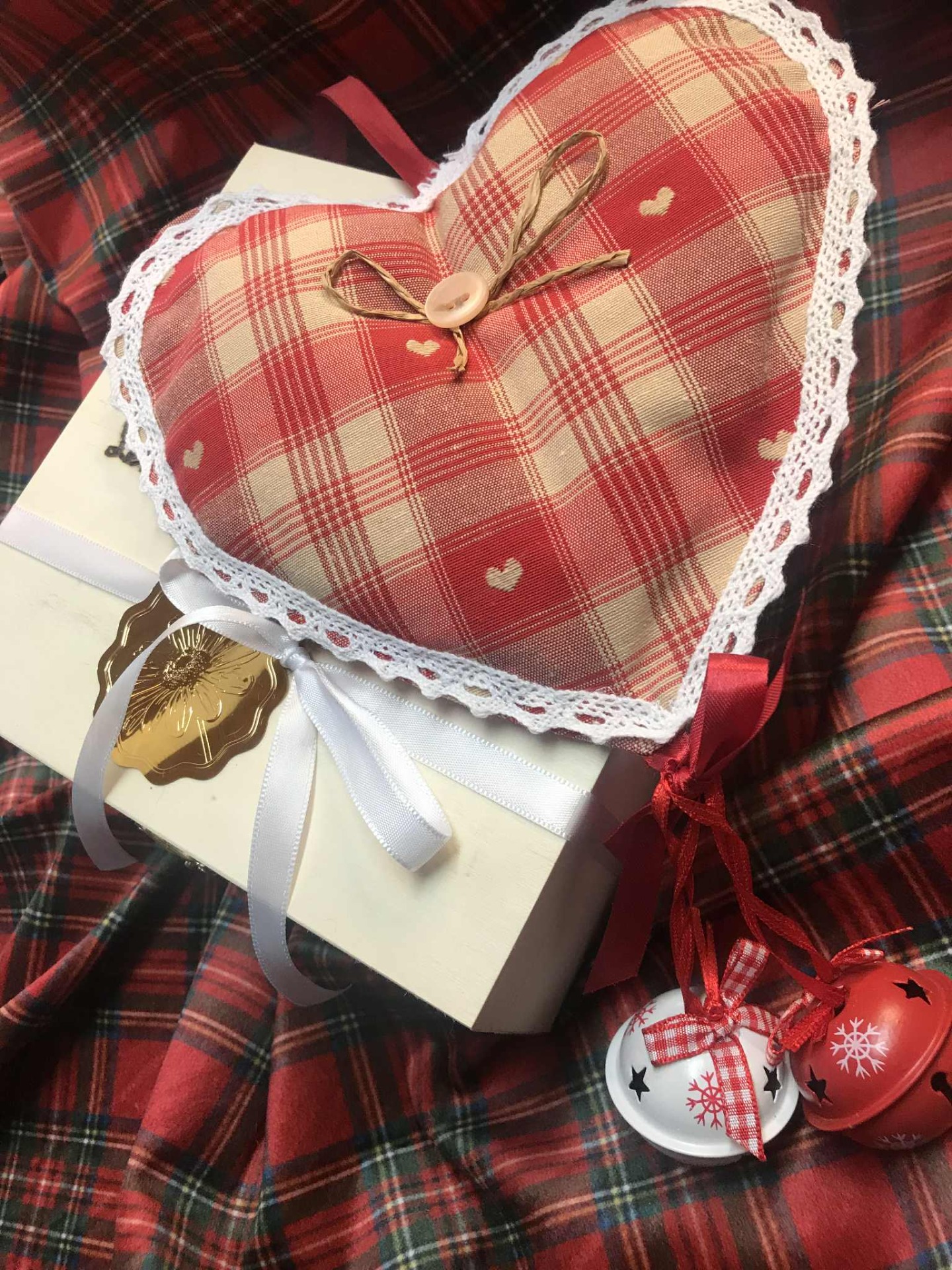 petit coeur en toile de Ladras rehaussé de ruban satin double face et agrémenté de deux grelots sonnant.